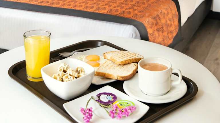 Das Hotel bietet ein stilvolles Restaurant, in dem täglich ein amerikanisches Frühstück mit frischen Säften, Obst und Gebäck serviert wird. Eine Zimmerservice-Option ist ebenfalls verfügbar.