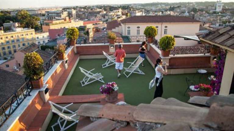 Das Hotel verfügt über eine wunderschöne Dachterrasse, auf der Sie die Aussicht auf Rom und die Umgebung genießen können. Hier können Sie entspannen und die Atmosphäre der Stadt auf sich wirken lassen.
