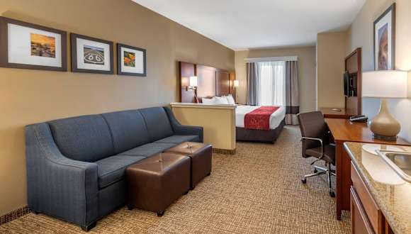 Die Comfort Suites Barstow near I-15 bieten 83 Nichtraucherzimmer auf 3 Etagen. Die Zimmer sind mit Annehmlichkeiten wie Klimaanlage, Mikrowelle, Kühlschrank, Safe, Schreibtisch, Fernseher und WLAN ausgestattet. Rollstuhlgerechte Zimmer mit barrierefreiem Badezimmer sind ebenfalls verfügbar.