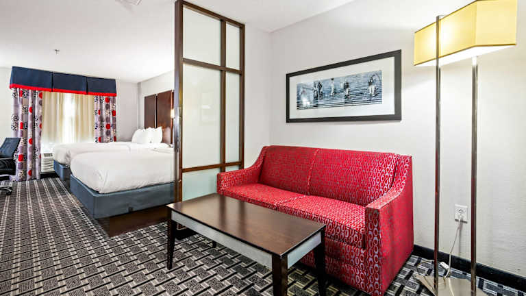 Die modernen Suiten im Comfort Suites Williamsburg Historic Area sind geräumig und bieten Annehmlichkeiten wie einen Flachbild-Kabel-TV, eine Mikrowelle, einen Kühlschrank und eine Kaffeemaschine. Jede Suite ist geschmackvoll eingerichtet und verfügt über kostenfreies WLAN sowie eine Sitzecke mit einem Schlafsofa. Die Zimmer sind in warmen Farben gehalten und mit dunklen Holzmöbeln ausgestattet.