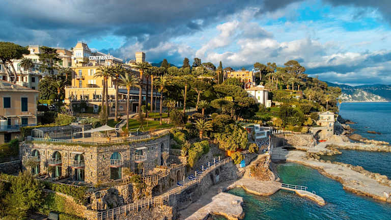 Das Hotel Continental thront auf dem malerischen Punta Pagana, direkt am Meer und bietet einen einzigartigen Panoramablick über die Bucht von Santa Margherita Ligure und den Monte di Portofino. Es liegt eingebettet in einen liebevoll angelegten Park mit jahrhundertealten Pinien und Steineichen und verfügt über einen privaten Kiesstrand mit kristallklarem Wasser Verkehrsanbindung: Nur 300 m trennen Sie vom Bahnhof Santa Margherita Ligure–Portofino, von dem aus regelmäßige Züge nach Genua und La Spezia verkehren. Der Flughafen Genua (Cristoforo Colombo) ist ca. 30 km entfernt (etwa 45 Minuten Fahrt) Ortskern & Promenade: Die charmante Altstadt von Santa Margherita Ligure mit ihrem lebhaften Hafen, zahlreichen Cafés, Bars und Boutiquen erreichen Sie in wenigen Gehminuten. Sehenswürdigkeiten vor der Haustür: Villa Durazzo: Renaissance-Villa mit weitläufigem Garten und Panoramablick. Kirche San Giacomo di Corte: Historisches Gotteshaus hoch über dem Ort. Cervara Abbey: Malerische Abtei an der Küstenstraße nach Portofino. Wanderwege: Die Trails des Naturparks Portofino beginnen direkt beim Hotel Tagesausflüge: Portofino: Die „Perle des Tigullio“ ist nur ca. 5 km entfernt und per Bus oder Boot in wenigen Minuten erreichbar. Cinque Terre: Mit dem Zug ab Bahnhof Santa Margherita Ligure in etwa 1 Stunde erreichbar. Genua: Historische Hafenstadt in rund 30 Minuten per Zug oder Auto.