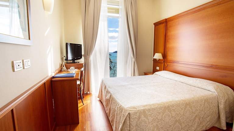 Sea Suite Area (10 Suiten) Die neuen Sea Suites des Hotel Continental liegen in einer ruhigen Parklage und sind über den Garten, den Strand oder einen eigenen Aufzug von der Lobby aus erreichbar. Jede Suite ist großzügig geschnitten, mit Molteni®-Möbeln ausgestattet und garantiert Meerblick. Zu den Unterkategorien gehören: Junior Suite Deluxe (38 m²): Doppelbett, Schlafsofa, elektrisches Verdunklungssystem, Smart-TV, Bad; einige Zimmer mit Balkon oder Terrasse. Junior Suite Deluxe Vista Mare (39 m²): wie Junior Suite Deluxe, ergänzt durch Panorama-Balkon/Terrasse mit Blick auf die Bucht. Junior Suite Deluxe con piscina privata (38 m²): Terrasse mit Sonnenliegen, Tisch und beheiztem 3,5 m²-Pool mit Hydromassage. Suite Deluxe (45 m²): zwei Panoramabalkone mit 360°-Meerblick, 50″ Smart-TV, luxuriöses en-suite Badezimmer. Suite Deluxe con piscina privata (46 m² + Terrasse > 40 m²): große Eckterrasse mit beheiztem Pool für vier Personen, Sonnenliegen und Sitzgruppe für maximale Privatsphäre. Junior Suite (ca. 23 m²) Befinden sich im Haupthaus mit Balkon oder Terrasse und Blick aufs Meer oder den Hafen von Santa Margherita Ligure. Maritime Pastell-Einrichtung, Doppel- oder Twin-Bett, Schlafsofa, Bad mit Wanne/Dusche, kostenfreies WLAN, Klimaanlage, TV, Minibar, Safe. Nichtraucher. Superior & Deluxe Superior Vista Mare (ca. 20 m²): Hauptgebäude, Balkon/Terrasse mit Meer- und Gartenblick, Holzdetails, Bad mit Wanne/Dusche. Deluxe Vista Mare (ca. 12 m², Dachgeschoss): Mansardenzimmer auf dem Attikageschoss, große Terrasse mit Sonnenliegen, Eichenparkett, Dusche und Ethimo®-Polstersessel. Einzelzimmer Singola (ca. 10 m²): Seite zur Straße/Hügel, Einzelbett, Bad mit Wanne/Dusche, WLAN, Klimaanlage, TV, Minibar, Safe. Singola Spaziosa (ca. 12 m²): französisches Bett (140 × 160 cm), wie Singola, etwas mehr Platz. Singola Spaziosa Vista Mare (ca. 12 m²): mit Balkon/Terrasse und Meerblick, dieselbe Ausstattung wie Spaziosa. Doppelzimmer (ca. 14 m²) Panoramica: Balkon/Terrasse mit Blick auf Park und Meer. Vista Giardino, lato Mare: privater Patio mit direktem Gartenzugang zum Strand oder kleiner Balkon mit Meerblick. Standard: Seite zur Straße/Hügel ohne Meerblick; sonstige Ausstattung identisch (Wanne/Dusche, WLAN, Klimaanlage, TV, Minibar, Safe). Dreibettzimmer (ca. 18 m²) Doppelbett plus Zustellbett oder Kinderbett, wahlweise zur Straße oder zum Garten/Meer ausgerichtet. Parkettboden, Bad mit Wanne/Dusche, WLAN, Klimaanlage, TV, Minibar, Safe. Nichtraucher.