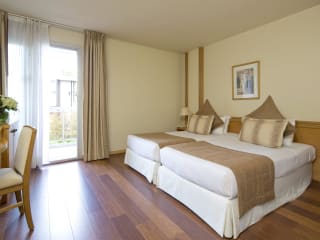 Die Zimmer sind klimatisiert und verfügen größtenteils über einen eigenen Balkon. Ausgestattet mit Teppichböden bieten sie ein Doppelbett, eine Minibar, einen Safe, einen Schreibtisch, einen Fernseher und WLAN ohne Gebühr. Die Badezimmer sind mit Dusche und Badewanne ausgestattet, und Kosmetikartikel stehen zur Verfügung. Auch rollstuhlgerechte Zimmer sind verfügbar.