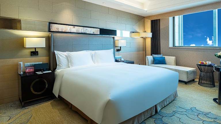 Die Zimmer im Crowne Plaza Xi'an sind elegant eingerichtet und bieten einen Blick auf die Skyline der Stadt. Sie sind klimatisiert und verfügen über kostenloses WLAN sowie einen 24-Stunden-Zimmerservice. Die Zimmer sind mit dunklen Holzmöbeln und Teppichböden ausgestattet und verfügen über einen Flachbild-TV, eine Minibar, einen begehbaren Kleiderschrank und Bügeleinrichtungen. Die privaten Badezimmer sind mit einer Badewanne und einem Haartrockner ausgestattet.