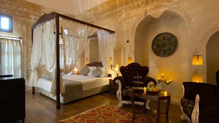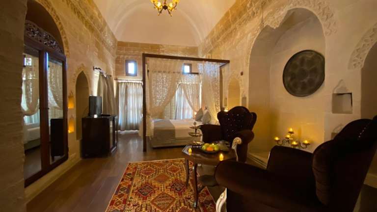 Das historische Dara Konagı in Mardin bietet seinen Gästen ein einzigartiges Erlebnis in einem 800 Jahre alten Steinhaus im arabischen Stil. Die Zimmer sind mit Steinwänden, Plasma-TVs und Minibar ausgestattet und versprechen einen komfortablen Aufenthalt. Entspannung finden Sie im Whirlpool oder im Garten. Das kostenlose WLAN ist im gesamten Hotel verfügbar. Die klimatisierten Zimmer beeindrucken mit geschwungenen Holzbetten, Gewölbedecken und Sat-TV. Von der Terrasse aus haben Sie eine herrliche Aussicht. Genießen Sie den kostenlosen Tee- und Kaffeeservice oder bringen Sie Ihre eigenen Getränke mit. Das Hotel befindet sich in der Nähe des Mardin-Museums und der Kirklar-Kirche. Der Flughafen Mardin ist nur 20 km entfernt und die syrische Grenze erreichen Sie in 40 Fahrminuten.