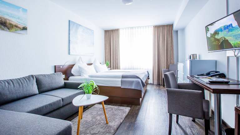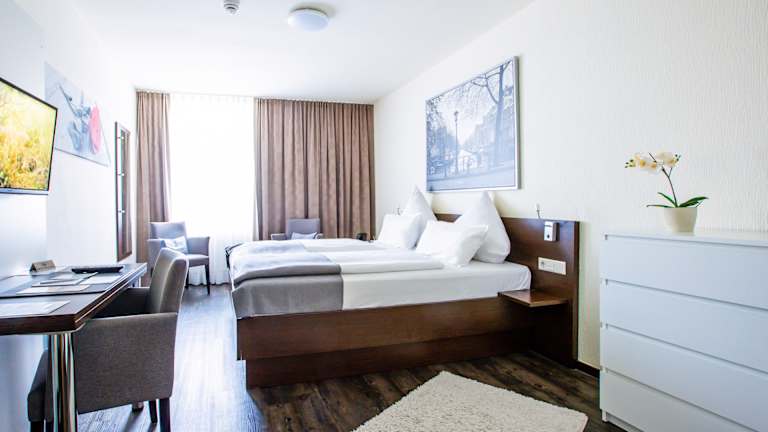 Die Lage des Hotel ist sehr günstig und eignet sich sowohl für Geschäftsreisende als auch für Urlaubsgäste. Das Hotel befindet sich in zentraler Lage in Troisdorf und bietet eine gute Anbindung an Autobahn und öffentliche Verkehrsmittel. Dadurch sind die Städte Köln und Bonn schnell und bequem erreichbar. Auch die Koelnmesse ist in kurzer Zeit zu erreichen, was das Hotel besonders attraktiv für Messebesucher und Geschäftsreisende macht. Der nahegelegene Flughafen Köln/Bonn ist ebenfalls nur wenige Fahrminuten entfernt. In der Umgebung finden sich außerdem verschiedene Restaurants, Cafés und Einkaufsmöglichkeiten, die gut zu Fuß erreichbar sind. Insgesamt bietet das Hotel eine ruhige, aber gleichzeitig sehr gut angebundene Lage.