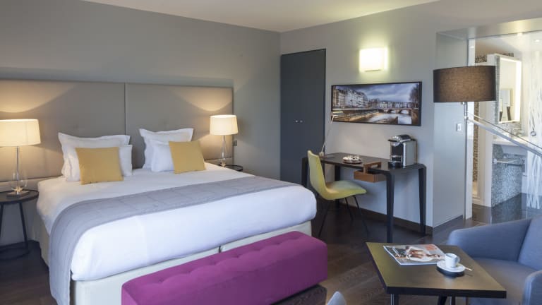 Die Zimmer im Hotel de l'Universite sind komfortabel und stilvoll eingerichtet. Sie bieten Annehmlichkeiten wie einen Flachbild-TV und eine Minibar. Die Zimmer sind mit dem Aufzug erreichbar und verfügen über kostenfreies WLAN. Die Einrichtung ist dezent und mit warmen Farbakzenten gestaltet, um eine gemütliche Atmosphäre zu schaffen.