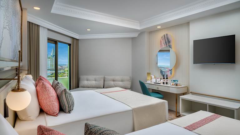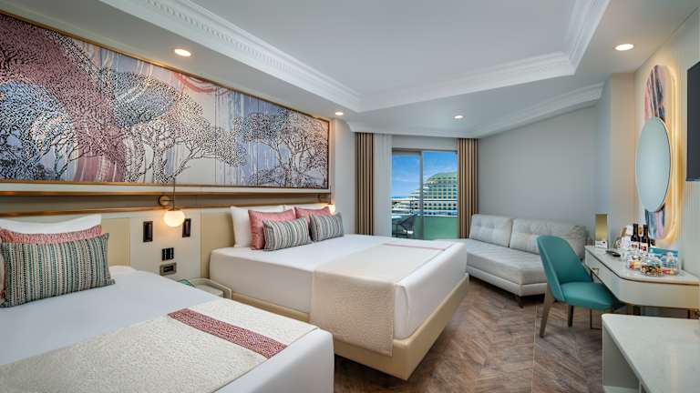 Standard Zimmer: ca. 28 – 32 m2 . Im Zimmer gibt es 1 Frenchbett, 1 Einzelbett und 1 Sofa. Zur weiteren Ausstattung gehören Haartrockner, Direktwahltelefon, Led-TV (Satellitenempfang und Musik), Safe, Minibar, Laminatboden, Dusche / WC, Klimaanlage (zentral, zwischen bestimmten Stunden), Wasserkocher, Tee, Kaffee und Balkon. Zimmerlage: Landblick, Meerblick oder seitlicher Meerblick. Jeden Tag Zimmerreinigung und Wechsel von Badetuch. Wechsel von Bettlaken jeden zweiten Tag einmal. (Unterkunft: maximal 3 Erwachsene und 1 Kind oder 2 Erwachsene + 2 Kinder) Schlafsofa: 180x80 cm. Technische Hotel Details für Gäste mit Behinderung: haben die gleiche Ausstattung wie Standartzimmer, behindertengerechte Dusche / WC, Landseite. Die Details: Tür 91,5 cm; Balkon Tür 92 cm; Aufzugtür Breite: 86 cm Badezimmer Tür 91,5 cm, Korridor Breite 120 cm; Waschbecken-Höhe 89,5 cm; WC Höhe 50 cm. Notruftaste vorhanden. Die Rezeption-RestaurantsPools und der Strand sind mit dem Rollstuhl möglich zu erreichen. Maximale Unterkunft Kapazität: 2 Erwachsene. Familien Zimmer: ca. 45 m2 . Es gibt 2 Schlafzimmer, 1 Frenchbett, 2 Einzelbetten, 1 Sofa. Zur weiteren Ausstattung gehören Dusche / WC, Direktwahltelefon, 2 Led –TV (Satellitenempfang und Musik), 2 Minibar, Safe, Laminatboden, Klimaanlage (zentral + stundenweise), Wasserkocher, Tee und Kaffee, Balkon. Jeden Tag Zimmerreinigung und Wechsel von Badetuch. Wechsel von Bettlaken jeden zweiten einmal. (Unterkunft: 3 Erwachsene + 2 Kinder oder 4 Erwachsene + 1 Kind) Schlafsofa: 180x80 cm Junior Suite: ca. 36 m2 . Im Zimmer gibt es 1 Frenchbett, 1 Einzelbett und 1 Sofa. Zur weiteren Ausstattung gehören Jacuzzi / WC, Haartrockner, Direktwahltelefon, Led TV (Satellitenempfang und Musik), Safe, Minibar, Laminatboden, Klimaanlage (zentral, stundenweise), Wasserkocher, Kaffeemaschine, Tee und Kaffee, Balkon. Jeden Tag Zimmerreinigung und Wechsel von Badetuch. Wechsel von Bettlaken jeden zweiten einmal. Zimmerlage: Meerblick und Terrasse. (Unterkunft: maximal 3 Erwachsene oder 2 Erwachsene + 1 Kind) Schlafsofa: 180x80 cm