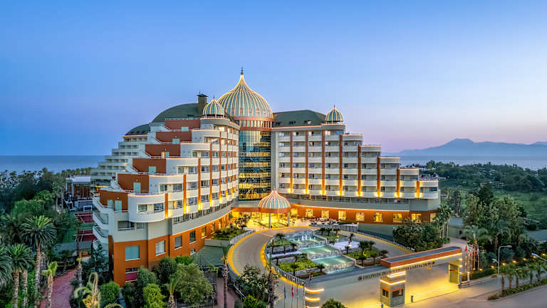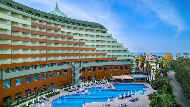 Leistungen die im Ultra All Inclusive Preis enthalten sind Offenes Buffet; Frühstück, Spätfrühstück, Mittagessen, Abendessen, Mitternachtssnack im Palm Sport & Snack Pub), 7 a la carte Restaurants sind pro Aufenthalt 1 mal kostenlos (Reservierung erforderlich), Lokale alkoholische und alkoholfreie Getränke sowie einige importierte (Lobby Bar, Joia Bar & Disco), Die Minibar wird täglich mit Bier, Cola, Fanta, Ice Tea, Mineralwasser, Wasser, Fruchtsaft, Schokolade, Cracker, Chips aufgefüllt, Safe im Zimmer, 2 Tennisplätze, Ausrüstung und Beleuchtung (mit Reservierung und gegen Kaution), Türkischer Hamam, Sauna, Dampfbad, Fitness Center, Aerobic, Wassergymnastik, Gymnastik, Tischtennis, Step, Kino, Die Nutzung des Relaxpools ist für Gäste unter 15 Jahren untersagt (in der Hochsaison), Hallenbad und Whirlpool, Haupt Pool, Kinder Pool, Pool mit Rutschen, Relax Pool, Die Öffnungszeiten der Pools können sich ändern und sind wetterabhängig, Sonnenschirme, Liegen, Auflagen, Badetücher (wetterbedingt), Tagsüber Sportturniere und Poolspiele, am Abend Revueshows, Sketch – und Animationsshow, Gelegentlich Live Musik und Disko, Im Zimmer und Lobby WiFi, Lunapark Offener Parkplatz. Leistungen die nicht im Ultra All Inclusive Preis enthalten sind Telefon, Fax, Friseur, Game Room, Billard, Bowling, Tischfussball, Computerspiele, Kosmetiksalon, Kleopatra Milchbad, Jacuzzi in Spa, diverse Massagearten, Peeling mit „Anti Stress’’Anwendungen, Internet Cafe, Wäscherei – und Bügelservice, Gesundheitsdienst und Arzt (zwischenzeitlich), 24 Stunden Zimmerservice Motorisierte und nicht motorisierte Wassersportarten Notizen: In den Restaurants und Bars werden die Getränke an die Tische serviert, kann auch von den Gästen selbst genommen werden. Für die Gäste unter 18 Jahren werden keine alkoholischen Getränke ausgeschenkt. Alkoholische Getränke werden nicht in Flaschen und nicht beim Frühstück serviert. Das Tragen eines Plastikarmbandes ist erforderlich. Es sind keine Haustiere gestattet. Am Pier sowie in allen Ausseneinrichtungen wird wetterabhängig Service geleistet. Die Ausleihe von Rollstuhl und Babywagen sind an der Rezeption auf Anfrage gegen Kaution möglich. Kreditkarten: Visa und Master Card