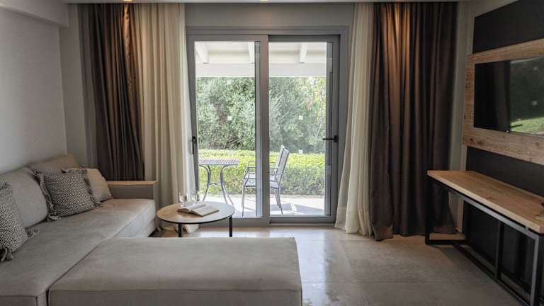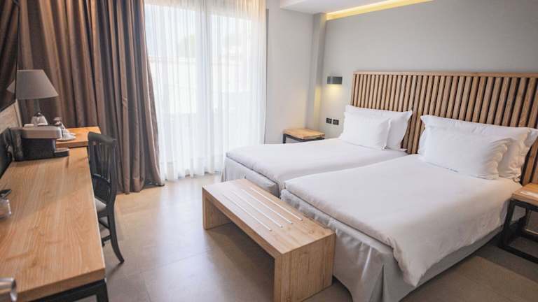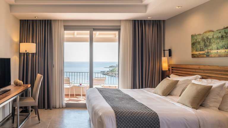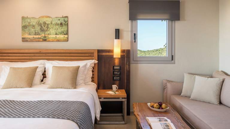 Die eleganten Zimmer im Domotel Agios Nikolaos verfügen über einen möblierten Balkon mit Meerblick und sind mit extra langen Betten und natürlichen Matratzen ausgestattet. Zur weiteren Ausstattung gehören ein 32-Zoll-Sat-TV, eine Minibar, eine Klimaanlage und hochwertige Pflegeprodukte.