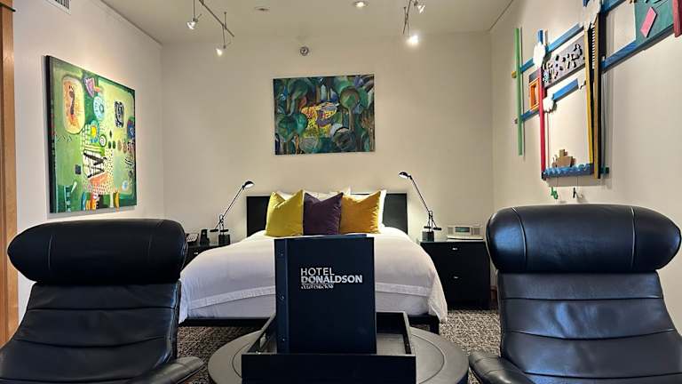 Die Zimmer im Hotel Donaldson sind mit einzigartigen Kunstwerken aus der Region dekoriert, die jedem Raum eine besondere Atmosphäre verleihen. Jedes Zimmer verfügt über kostenfreies WLAN, einen Flachbild-TV, eine Bose-Stereoanlage und einen Kühlschrank. Die stilvolle Einrichtung und die hochwertigen Annehmlichkeiten sorgen für einen komfortablen Aufenthalt.