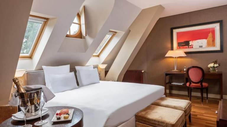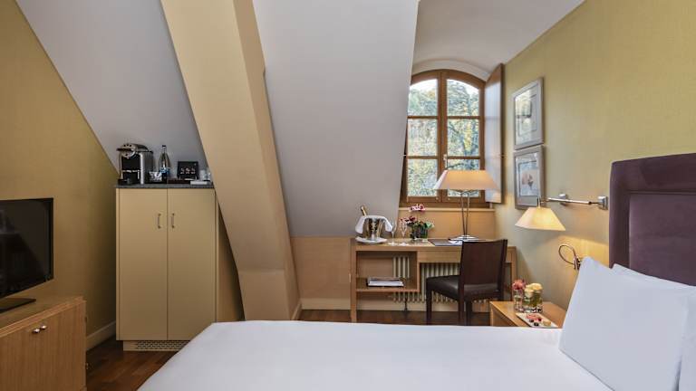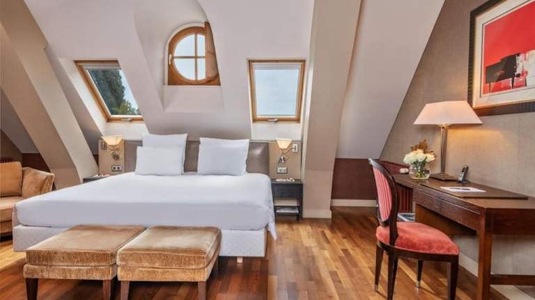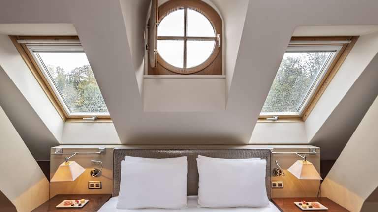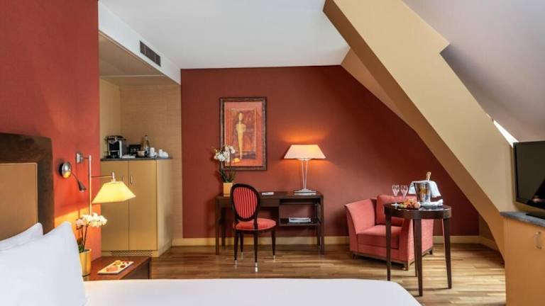 Die Zimmer des Hotels sind mit luxuriösen Stoffen in Pastellfarben eingerichtet, verfügen über schräg abfallende Decken und bieten ein angenehmes Raumklima dank Klimaanlage und Heizung. Zu den Annehmlichkeiten zählen ein Balkon, ein Safe, eine Minibar, ein Minikühlschrank, eine Tee-/Kaffeemaschine, ein Fernseher mit Kabelempfang, ein DVD-Player und kostenfreies WLAN. Die Badezimmer sind mit einer Dusche, einer Badewanne und einer Whirlwanne ausgestattet. Haartrockner und Bademäntel sind ebenfalls vorhanden. Rollstuhlgerechte Zimmer sind buchbar.