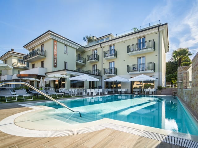Hotel Eden Garda ****, komplett renoviert, befindet sich ca. 1 km vom Garda See und den wichtigsten Dienstleistungen. Es bietet einen kostenlosen Shuttle-Service für die Gäste in der Zeit von Mai bis September. Alle Zimmer sind geräumig, hell und geschmackvoll eingerichtet. Sie verfügen alle über Balkon, Bad mit Dusche, Haartrockner und kostenlosen Toilettenartikeln, Sat-TV, kostenlosen Wi-Fi, Klimaanlage, Minibar, Safe, Direktwahltelefon, elektrischen Wasserkocher für Tee und Kaffee. Das Hotel verfügt über Lift, einen eigenen Parkplatz und Garage, TV-Raum und ein Konferenzraum. Entspannen Sie im unseren Garten mit dem Pool und dem neuen und modernen Snackbar Service oder auf der Sonnenterrasse mit Blick auf den Garda See und Hydromassage-Pool. In dem klimatisierten Restaurant können Sie am Morgens ein reichhaltiges Frühstücksbuffet finden. Unser Küchenchef wird Sie mit einer reichen Auswahl an mediterranen und internationalen Rezepte überraschen, zusammen mit ausgewählten Weinen aus unserem Weinkeller.