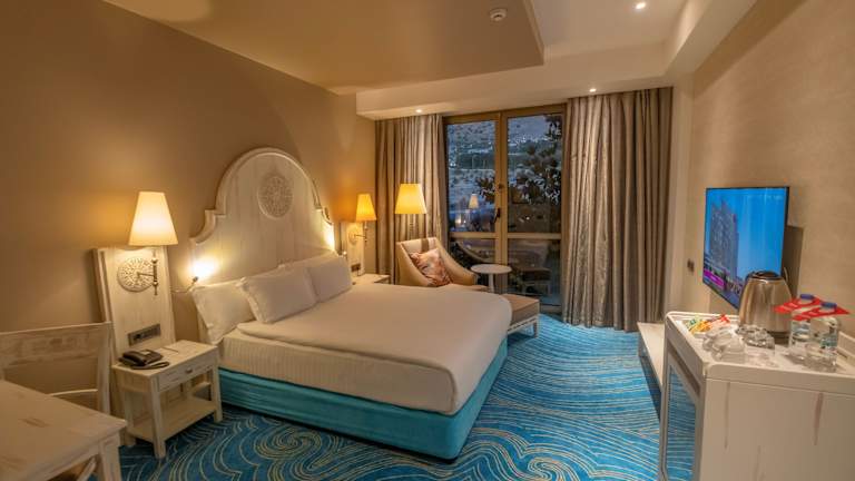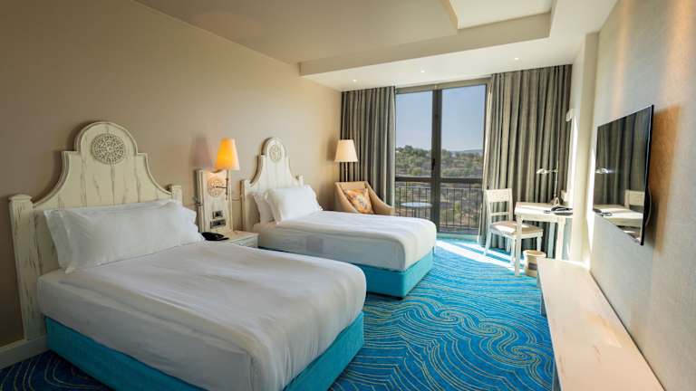 Die Zimmer des Hotels sind mit Klimaanlage und individuell regulierbarer Heizung ausgestattet. Die überwiegende Mehrheit der Zimmer verfügt über einen Balkon. Zur Standardausstattung gehören ein Doppelbett oder Kingsize-Bett, ein Safe, eine Minibar, ein Schreibtisch sowie eine Tee-/Kaffeemaschine. Zudem sind eine Waschmaschine, ein Bügelset und eine Hosenpresse vorhanden. Zu den technischen Annehmlichkeiten zählen ein Telefon mit Direktwahl, ein TV-Gerät mit Satelliten-/Kabelempfang und kostenloses WLAN. In den Badezimmern erwartet die Gäste eine Kombination aus Dusche und Badewanne, sowie kostenfreie Kosmetikartikel. Barrierefreie Badezimmer sind ebenfalls buchbar.