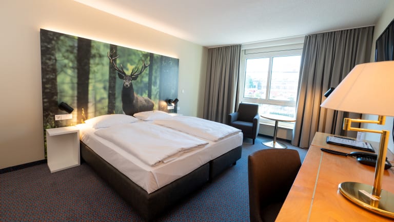 45 Einzel- & 48 Doppelzimmer Zimmer-Kategorien: - Einzelzimmer Komfort/Superior Die freundlichen Einzelzimmer sind mit Klimaanlage, schallisolierten Fenstern, WLAN, Direktwahltelefon, TV und einer Minibar ausgestattet. Das helle Bad verfügt über einen großen Spiegel, Haartrockner, Dusche, WC und eine geräumige Ablage. Die Zimmer der Komfort-Kategorie sind zur Straße hin ausgerichtet. Die Superior-Zimmer liegen zur ruhigeren Rückseite des Hotels. Größe der Betten: Breite: 90 - 160 cm Länge: 200 cm - Komfort/Superior-Doppelzimmer Die freundlichen Doppelzimmer sind mit Klimaanlage, schallisolierten Fenstern, WLAN, Direktwahltelefon, TV und einer Minibar ausgestattet. Das helle Badezimmer verfügt über einen großen Spiegel, Haartrockner, Dusche, WC und eine geräumige Ablage. Die Zimmer der Komfort-Kategorie sind zur Straße hin ausgerichtet. Die Superior-Zimmer liegen zur ruhigeren Rückseite des Hotels. Größe der Betten: Breite: 180 - 200 cm Länge: 200 cm - Zweibettzimmer Die freundlichen Zweibettzimmer sind mit Klimaanlage, schallisolierten Fenstern, WLAN, Direktwahltelefon, TV und einer Minibar ausgestattet. Das helle Badezimmer verfügt über einen großen Spiegel, Haartrockner, Dusche, WC und reichlich Ablagemöglichkeiten. Die Zimmer mit zwei getrennten Betten liegen zur Straße hin. Größe der Betten: Breite: 140 cm Länge: 200 cm - Komfort/Superior Dreibettzimmer Die geräumigen Dreibettzimmer sind mit Klimaanlage, schallisolierten Fenstern, WLAN, Direktwahltelefon, TV und einer Minibar ausgestattet. Das helle Badezimmer verfügt über einen großen Spiegel, Haartrockner, Dusche, WC und viel Ablagefläche. Die Zimmer der Komfort-Kategorie sind zur Straße hin ausgerichtet. Die Superior-Zimmer liegen zur ruhigeren Rückseite des Hotels. Größe der Betten: Zimmervariante 1: Doppelbett + Einzelbett Breite: 180 cm (Doppelbett) | 90 (Einzelbett) Länge: 200 cm Zimmervariante 2: Doppelbett + Ausziehcouch Breite: 180 cm (Doppelbett) | 140 cm (Schlafcouch) Länge: 200 cm