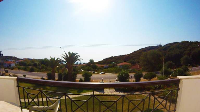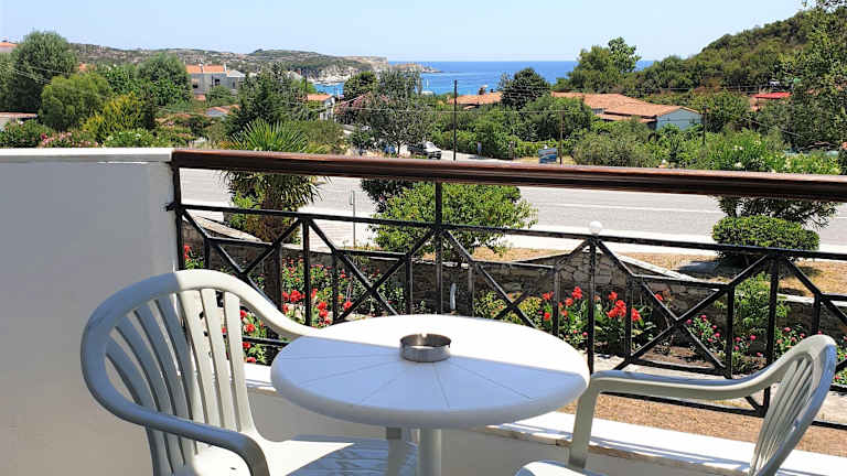 Die Zimmer im Hotel Ermioni sind klimatisiert und bieten einen eigenen Balkon mit Blick auf die Ägäis. Sie sind hell und geräumig mit raumhohen Fenstern, die viel Tageslicht hereinlassen. Zur Ausstattung gehören auch ein kleiner Kühlschrank und ein gemütlicher Sitzbereich. Hier können Sie sich nach einem Tag am Strand entspannen.