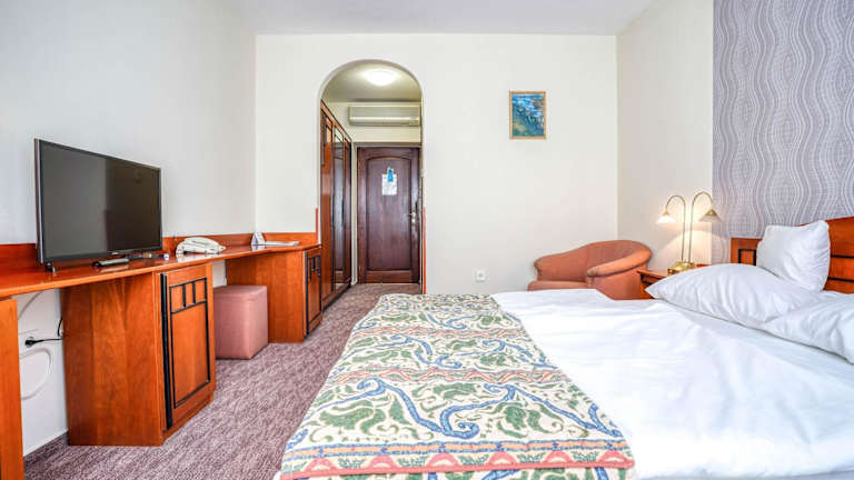 Die Zimmer im Hotel Erzsébet sind komfortabel eingerichtet und verfügen über eine Klimaanlage für angenehme Temperaturen. Die meisten Zimmer verfügen auch über eine Terrasse, auf der Sie entspannen können. Zur Ausstattung gehören außerdem eine Minibar, ein Telefon, Sat-TV, ein Radio und WLAN. Die Badezimmer sind mit einer Dusche, einer Badewanne und einer Whirlwanne ausgestattet. Haartrockner und Bademäntel stehen Ihnen zur Verfügung.