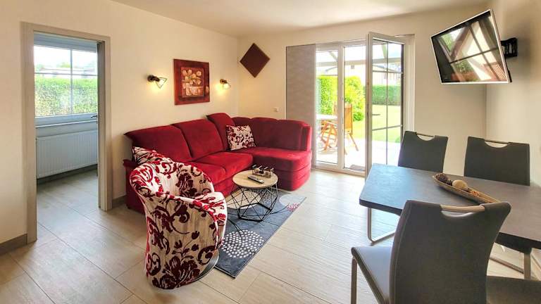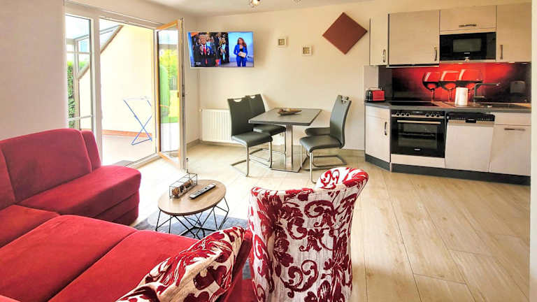 Das lichtdurchflutete Apartment verfügt über einen Flachbild-TV, einen großen Garten und eine voll ausgestattete Küche. Die Einrichtung ist modern und hell, und es gibt einen gemütlichen Sitz- und Essbereich. Vom Apartment aus haben Sie einen schönen Blick auf den Garten und können die Terrasse nutzen. Das Badezimmer ist mit einer Dusche ausgestattet.