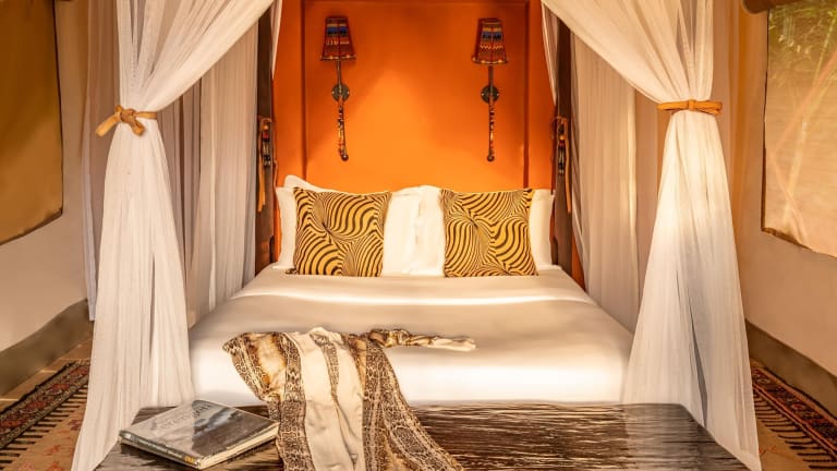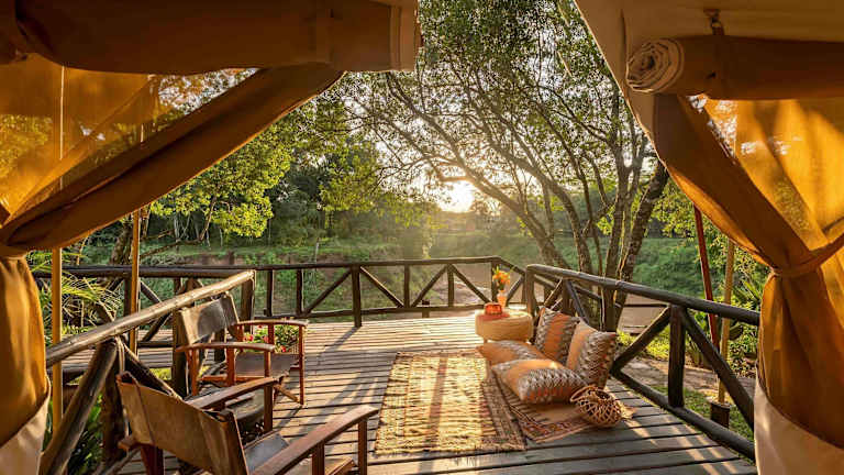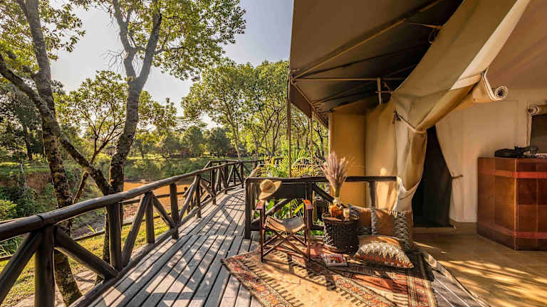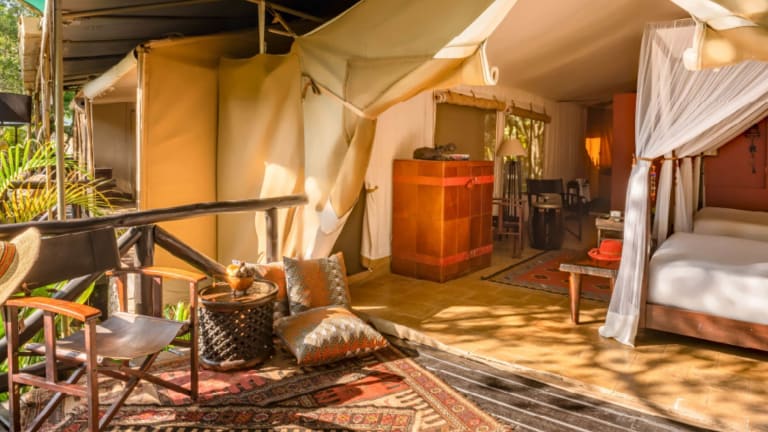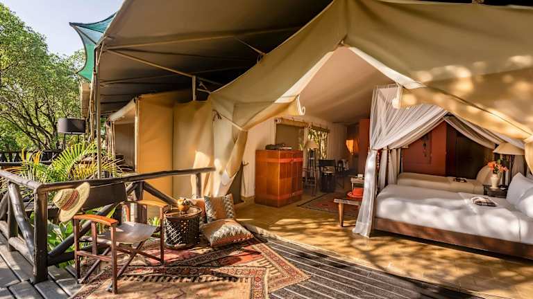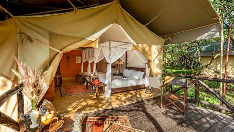 Die 51 Nichtraucherzimmer des Hotels bieten eine komfortable und authentische Safari-Atmosphäre. Die Zimmer verfügen über Himmelbetten, eine Minibar, einen Ventilator und eine eigene Veranda mit Sitzgelegenheiten im Freien. Einige Zelte verfügen über eine eigene Dusche im Außenbereich, während andere eine private Veranda zum Essen im Freien bieten.