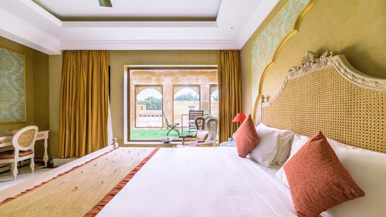 Das Hotel Fort Rajwada befindet sich in Jaisalmer, nur 2 km vom Bahnhof Jaisalmer und 10 km vom Flughafen Jaisalmer entfernt. Der Flughafen Jodhpur liegt 300 km entfernt. Die Umgebung bietet eine Mischung aus traditioneller Architektur und modernen Annehmlichkeiten.