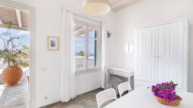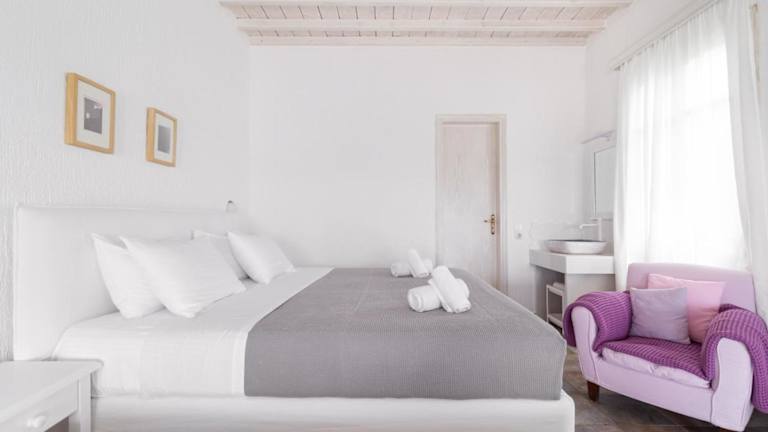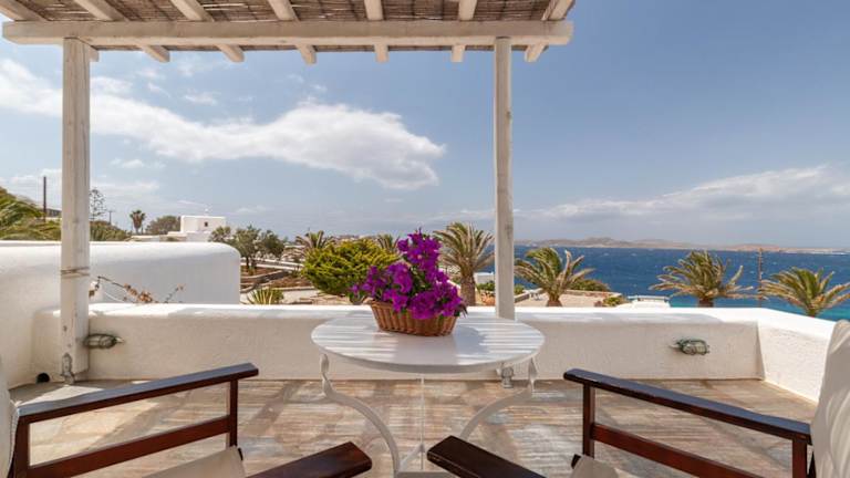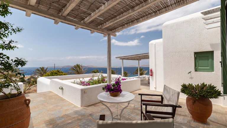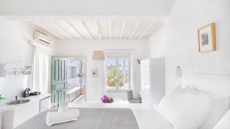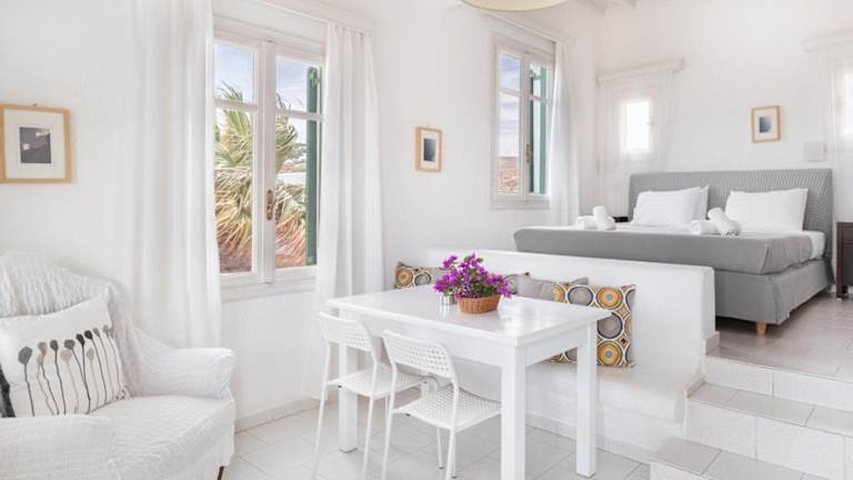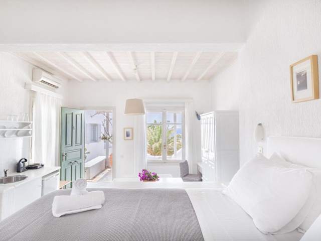 Das stilvolle Fos Suites Hotel in Agios Ioannis, Mykonos, bietet eine ideale Unterkunft für einen erholsamen Urlaub. Die geräumigen Suiten sind individuell gestaltet und bieten einen Balkon mit herrlichem Blick auf die Ägäis und die Insel Delos. Die Nähe zum Strand und die moderne Ausstattung machen den Aufenthalt zu einem unvergesslichen Erlebnis.
