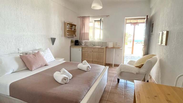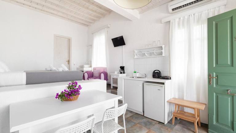 Die geräumigen und klimatisierten Suiten im Fos Suites Hotel sind individuell gestaltet und mit sanften Erdtönen dekoriert. Jede Suite verfügt über einen Balkon mit Meerblick, einen TV, einen Safe, einen Sitzbereich und eine Küchenzeile mit Wasserkocher und Kühlschrank. Die privaten Badezimmer sind mit einer Dusche und kostenfreien Pflegeprodukten ausgestattet.