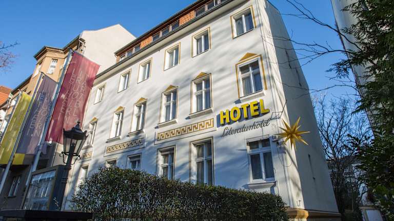 Das Literaturhotel Berlin befindet sich im eleganten Stadtteil Friedenau in Berlin. Es liegt nur 10 Minuten mit dem Auto vom Flughafen Tegel und etwa 10 Minuten mit der Bahn vom Potsdamer Platz entfernt. Die Lage ist ideal, um sowohl die historischen Sehenswürdigkeiten Berlins als auch das moderne Stadtzentrum zu erkunden. Der S-Bahnhof Friedenau ist nur 5 Gehminuten vom Hotel entfernt, was eine bequeme Anbindung an das öffentliche Verkehrsnetz ermöglicht. In der näheren Umgebung finden Sie auch zahlreiche Geschäfte, Restaurants und Cafés.