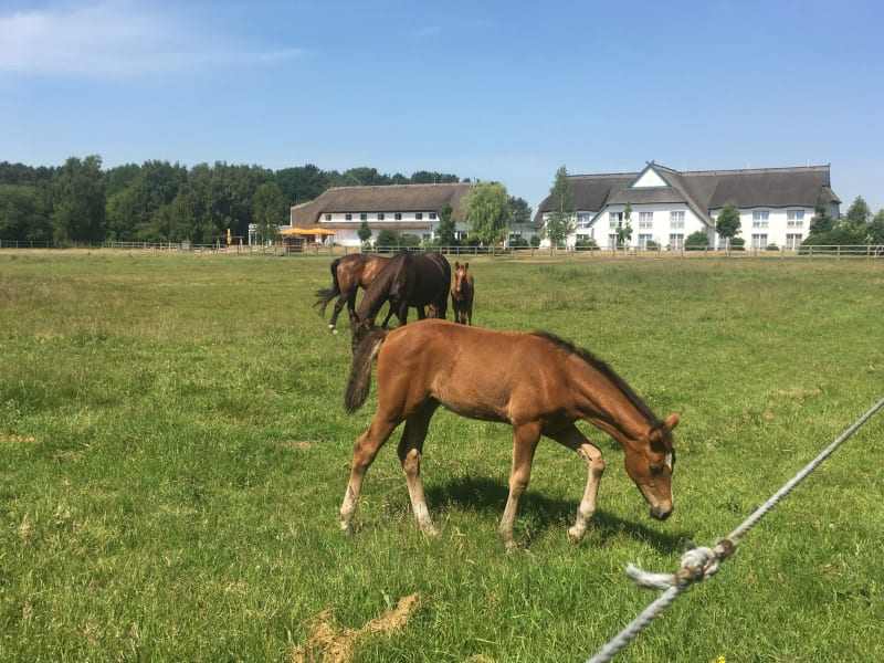 Im Hotel befindet sich ein moderner Poolbereich mit Panorama-Blick ins Grüne sowie eine kleine finnische Sauna. Im gut ausgestatteten Fitnessraum stehen verschiedene Cardiogeräte und eine Multifunktions-Kraftstation bereit. Neben dem Hotel liegt der moderne Reitstall mit Außenreitplatz, wettergeschützter Halle und etwa 20 eigenen Pferden und Ponies. Es werden Reitstunden, Gelände- und Strandritte angeboten. Im modernen Stall stehen außerdem Gastboxen für eigens mitgebrachte Pferde zur Verfügung.