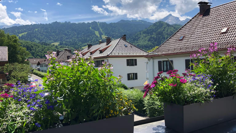 In Partenkirchen in der Nähe des Bahnhofs. Das Zentrum von Garmisch und Partenkirchen ist fußläufig in weniger als 15 Minuten erreichbar. Die Wanderwege beginnen in unmittelbarer Nähe.