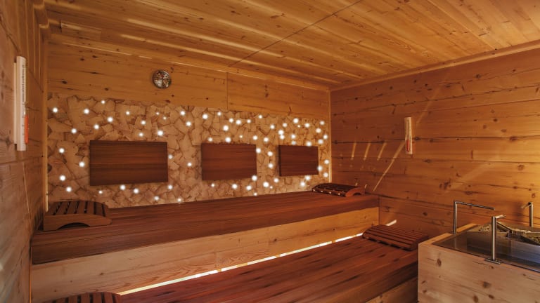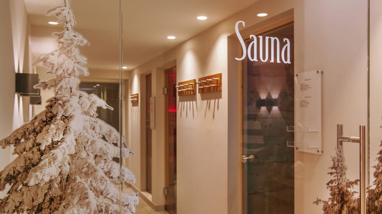 Chasa Sulai Wellness & Spa-Anlage mit Finnischer Sauna, Bio Sauna, Dampfbad, Infrarotkabine, Ruheraum mit Wellnessliegen und Wasserbetten, gemütliche Lounge mit Vitamin Bar.