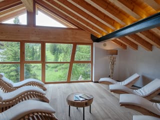 Wellnessanlage mit Sauna, Dampfbad und meditative Stimmung mit einmaliger Aussicht vom Ruheraum mit Wasserbetten und Zirbenbetten.
