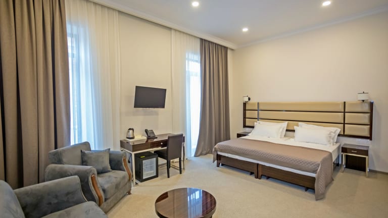 Das Hotel Genio in Tiflis ist der ideale Ort für einen angenehmen Aufenthalt im Stadtteil Vake. Mit kostenfreiem WLAN, kostenfreien Privatparkplätzen und einem entspannenden Garten bietet das Hotel den perfekten Ort, um sich zu erholen. Die klimatisierten Zimmer sind mit Flachbild-Sat-TV ausgestattet und einige Zimmer verfügen über einen gemütlichen Sitzbereich. Genießen Sie eine Tasse Tee mit herrlichem Blick auf die Berge, den Garten oder die Stadt. Das eigene Bad ist mit einer Dusche ausgestattet. An der Hotelbar können Sie erfrischende Getränke genießen und die 24-Stunden-Rezeption steht Ihnen jederzeit zur Verfügung. Entdecken Sie die Sehenswürdigkeiten von Tiflis, wie das Rustaweli-Theater und den Freiheitsplatz, die beide in der Nähe des Hotels liegen. Der internationale Flughafen Tiflis ist nur 22 km entfernt.