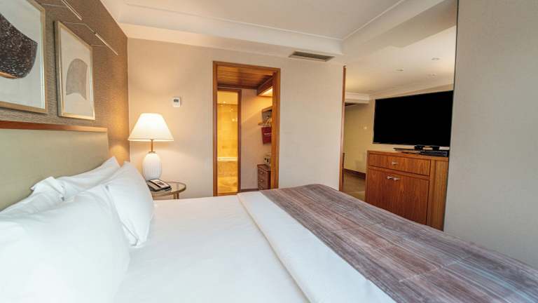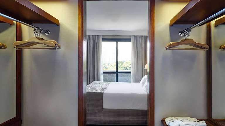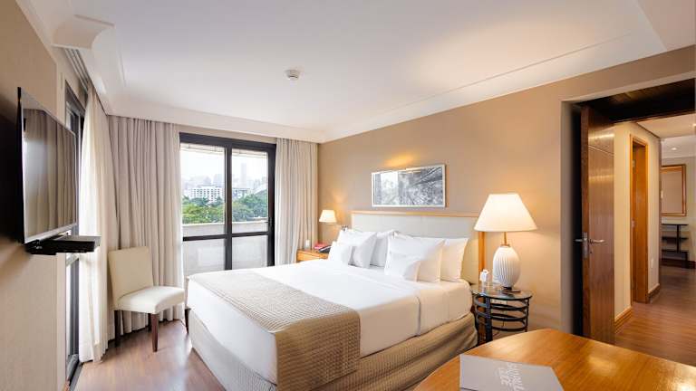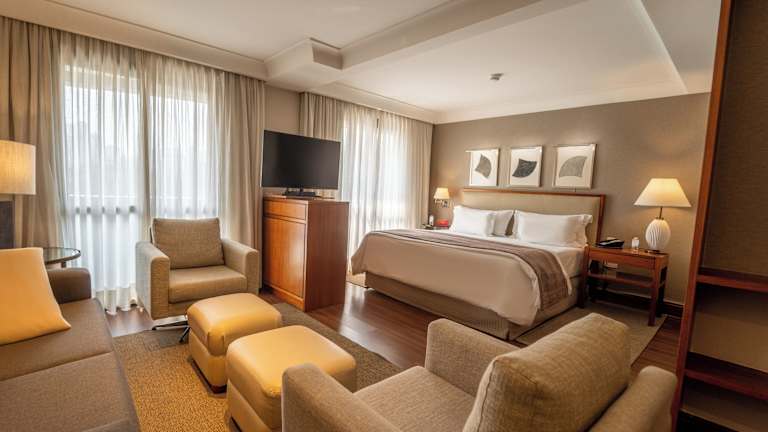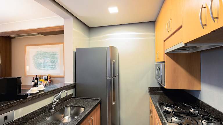 Die luxuriösen Suiten im George V Alto De Pinheiros Hotel sind stilvoll eingerichtet und bieten alle Annehmlichkeiten, die man für einen komfortablen Aufenthalt benötigt. Die Zimmer verfügen über eine voll ausgestattete Küche mit Essbereich, in der Sie Ihre eigenen Mahlzeiten zubereiten können. Ein gemütlicher Sitzbereich lädt zum Entspannen ein. Alle Zimmer sind klimatisiert und mit Kabel-TV ausgestattet.