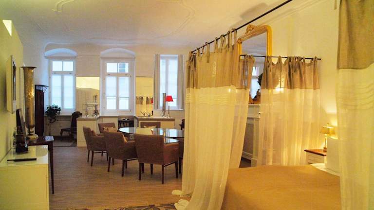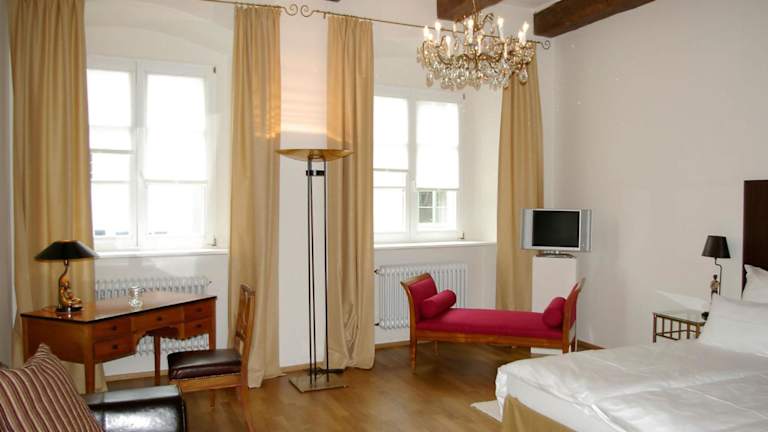 Die Zimmer im Hotel Goldenes Kreuz sind elegant gestaltet und bieten geräumige Unterkünfte mit antiken Möbeln und Massivholzböden. Jedes Zimmer verfügt über einen gemütlichen Sitzbereich, einen Flachbild-TV und ein modernes Bad mit einem Haartrockner. Hier können Sie sich nach einem langen Tag in der Stadt entspannen und den Komfort genießen.