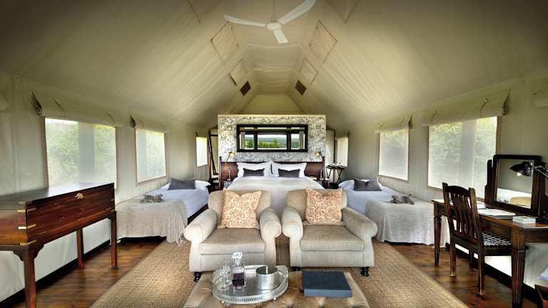 Die luxuriösen Suiten im Gorah Elephant Camp befinden sich in Zelten und bieten einen einzigartigen Rückzugsort in der Natur. Jede Suite verfügt über eine private Terrasse mit Panoramablick und gemütliche Innenräume. Zur Ausstattung gehören Kaffee- und Teezubehör sowie ein eigenes Bad mit Dusche und kostenfreien Pflegeprodukten. Die Suiten sind geräumig und bieten allen Komfort, den Sie für einen erholsamen Aufenthalt benötigen.