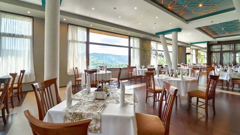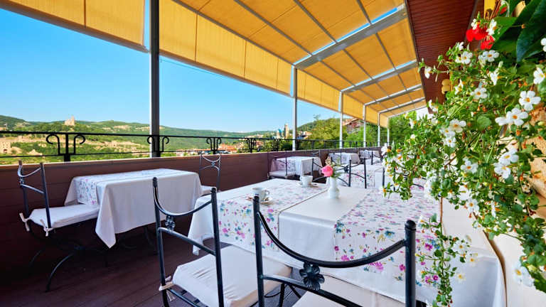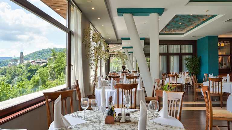 Das Hotelrestaurant erstreckt sich über zwei Säle und bietet Platz für bis zu 250 Personen. Hier können die Gäste eine Auswahl an internationalen und einheimischen bulgarischen Gerichten genießen. Das Restaurant serviert auch Spezialitäten, die nach authentischen mittelalterlichen bulgarischen Rezepten zubereitet werden. Die Panoramaterrasse Trapezitsa, die an das Restaurant angeschlossen ist, bietet einen herrlichen Blick auf die Burg Tsarevets, den Trapezitsa-Hügel und den Fluss Yantra.