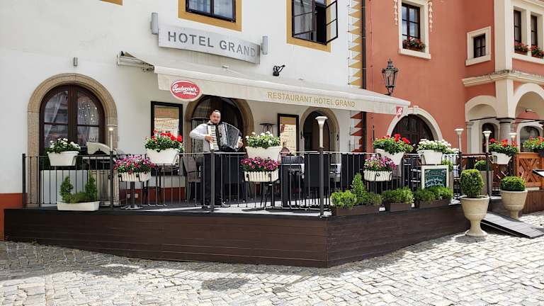 Das Hotel Grand ist ein charmantes Hotel im Herzen von Český Krumlov, das in einem denkmalgeschützten Gebäude direkt am historischen Hauptplatz liegt. Hier erwartet Sie eine komfortable Unterkunft mit kostenfreiem WLAN und einem leckeren Frühstücksbuffet. Das Hotelrestaurant verwöhnt Sie mit tschechischen und internationalen Spezialitäten. Genießen Sie Ihre Mahlzeiten und den herrlichen Ausblick auf den Hauptplatz. Die Lage des Hotels ist ideal, um die Sehenswürdigkeiten von Český Krumlov zu erkunden und die Umgebung beim Wandern oder Kanufahren zu entdecken.