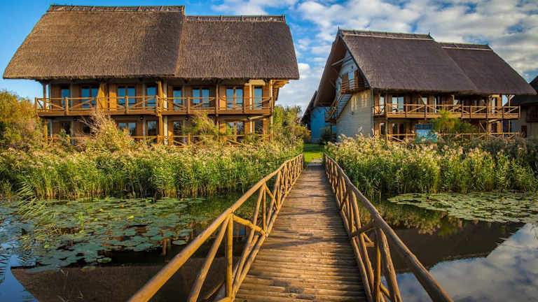 Das Green Village Resort befindet sich in einer idyllischen Lage im Donaudelta, nur 2 km vom Schwarzen Meer entfernt. Hier können Sie die atemberaubende Naturkulisse genießen und die Ruhe und Schönheit dieser einzigartigen Gegend erleben. Das Resort ist nur per Boot erreichbar, was zu einem zusätzlichen Abenteuer und einer besonderen Atmosphäre beiträgt. Wenn Sie mit dem Auto anreisen, können Sie Ihr Fahrzeug in der Stadt Murighiol parken, die etwa 47 km entfernt liegt.