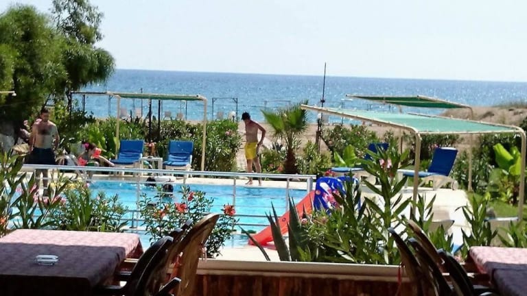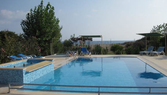 Von der Speiseterrasse sind es nur wenige Schritte zum Pool mit getrennten Kinderplanschbecken, Brause und Liegeplätzen. Dazu ein eigener Strandabschnitt im ruhigsten Teil des etwa 5 km langen Kizilot-Strandes. Liegen unter Sonnendächern stehen bereit.