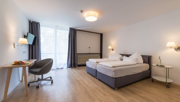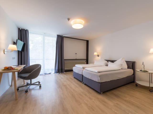 Die großzügigen, renovierten Komfort-Zimmer sind mit Boxspring-Betten, Flachbildfernseher (Sat-TV), WLAN und Bad (Dusche/WC, Haartrockner) ausgestattet. Die Zimmer haben bodentiefe Fenster, die meisten auch einen kleinen französischen Balkon mit Ausblick in den Teutoburger Wald oder in den Innenhof.