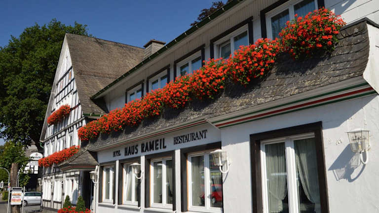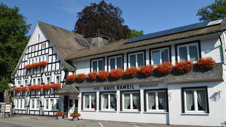 Das Hotel Haus Rameil befindet sich in Lennestadt im Ortsteil Saalhausen, einem ruhigen und idyllischen Teil der Stadt. Die Umgebung ist von wunderschönen Fachwerkhäusern und einer malerischen Landschaft geprägt. Die Waldlandschaft des Sauerlandes bietet zahlreiche Möglichkeiten zum Wandern, Radfahren und Motorradfahren. Das Stadtzentrum von Lennestadt und der Bahnhof Lennestadt-Altenhundem sind nur eine kurze Autofahrt entfernt.