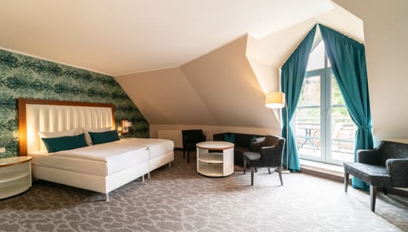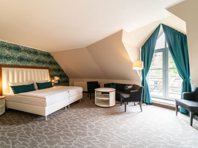 Was gibt es Schöneres, als eine Nacht auf dem Land zu verbringen, von Vogelgezwitscher geweckt zu werden und in eindrucksvoller Umgebung Zeit zu verbringen? Das Besondere an unseren 106 Zimmern und Suiten: Sie verbinden ausgesuchtes Design mit der Natur. Warme Farben, geschmackvolle Stoffe kombiniert mit Holz- und Steinelementen – den natürlichen Materialien des Waldes direkt vor unserer Tür – schaffen eine wohlige Atmosphäre und friedliche Rückzugsorte mit Charme. Das i-Tüpfelchen: Der Ausblick aus dem Zimmer oder vom Balkon! Unser Garten, der hauseigene Wald, und das glitzernde Wasser der Thülsfelder Talsperre, das bei Sonnenschein zum Greifen nah scheint. Highspeed- WLAN I Flat-Screen-TV I Schreibtisch mit Stuhl I Sitzgelegenheit I Safe I 1 Flasche Wasser I Wasserkocher mit Kaffee und Teeauswahl I Minibar-Kühlschrank mit kosten-pflichtigen Getränken I WC I Dusche I Wellnesspaket mit Bademantel, Saunahandtüchern & Slippern I Fön I Auswahl an Kosmetikprodukten I mit Aufzug erreichbar I