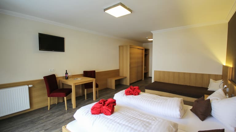 Dezent und zurückhaltend ist die Ausstattung der großzügigen Zimmer, mit angenehmen Farben und hochwertigen Schränken, Sitzmöbeln sowie Betten. Das Zimmerservice erfüllt gerne Ihre individuellen Wünsche. Auf Sie wartet je nach Wunsch ein Einzel-, Doppel-, Dreibett- oder auch Vierbettzimmer in großzügigem Design. Alle Zimmer sind mit TV, Safe und Telefon ausgestattet. Ihr Badezimmer verfügt über eine Dusche oder Badewanne, WC, Föhn, Radio und einen beleuchteten Schminkspiegel. W-LAN steht Ihnen in allen Zimmern kostenlos zur Verfügung.