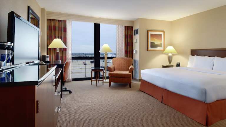 Die Zimmer im Hilton Chicago O'Hare Airport sind komfortabel und modern eingerichtet. Sie verfügen über schallisolierte Fenster und Verdunkelungsvorhänge, um Ihnen einen ruhigen und erholsamen Aufenthalt zu ermöglichen. Zur Ausstattung gehören ein 42-Zoll-Flachbild-HD-TV, ein Schreibtisch mit ergonomischem Stuhl und kostenfreies WLAN in der Lobby. Der Zimmerservice steht Ihnen täglich von 17:00 bis 23:00 Uhr zur Verfügung.