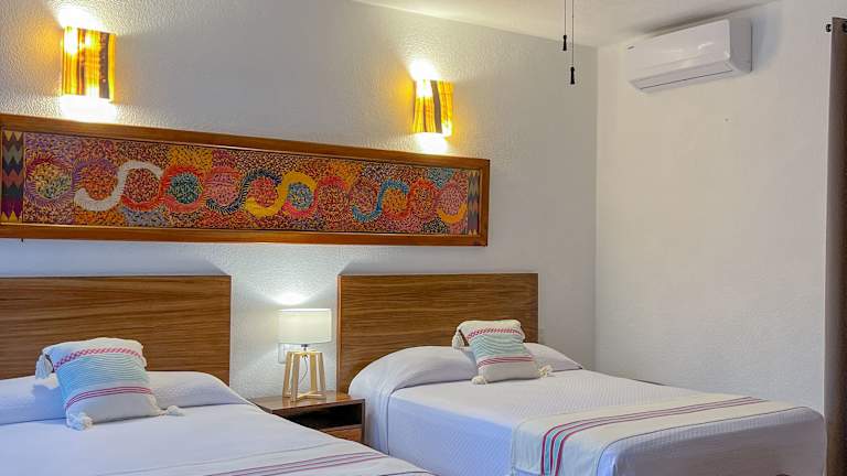 Das Hotel Hulku in Playa del Carmen bietet seinen Gästen einen entspannten Aufenthalt in unmittelbarer Nähe zu den Stränden. Mit seinem weitläufigen Garten, der Holzterrasse mit Hängematten und dem schönen Brunnen lädt es zum Verweilen und Entspannen ein. Die Zimmer sind komfortabel ausgestattet und einige verfügen über eine Kaffeemaschine und eine Küchenzeile. Das Hotel liegt zentral und in der Nähe der Quinta Avenida mit ihren zahlreichen Restaurants, Bars und Diskotheken. Es ist auch ein idealer Ausgangspunkt, um die Umgebung zu erkunden, einschließlich des Vergnügungsparks Xcaret und des Zentrums von Puerto Aventura.