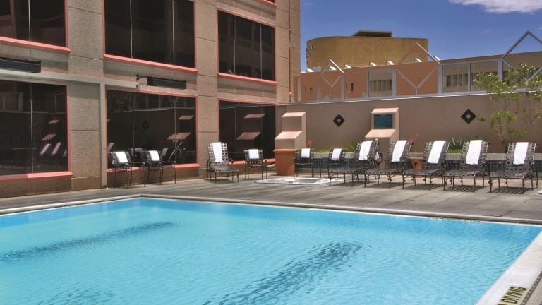 Das The Clyde Hotel in Albuquerque ist ein luxuriöses Hotel, das sich im Herzen der Stadt befindet und eine ideale Lage bietet, um die historische Altstadt und das Viertel Nob Hill zu erkunden. Mit seinem einzigartigen Pueblo-Deco-Stil und kostenfreiem WLAN bietet das Hotel eine komfortable und stilvolle Unterkunft. Genießen Sie die Annehmlichkeiten wie das Restaurant, den Außenpool auf dem Dach und den Whirlpool. Das Hotel bietet auch einen Fitnessraum und einen Conciergeservice für zusätzlichen Komfort.