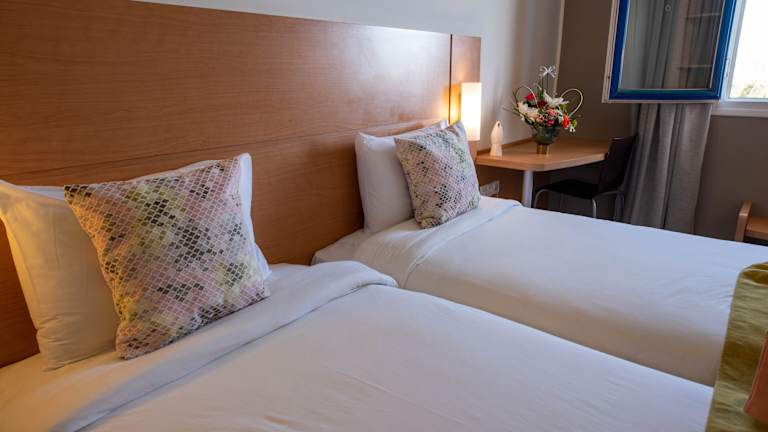 Das Hotel bietet 151 Zimmer, darunter Einzel- und Doppelzimmer sowie Apartments, die über zwei Etagen verteilt sind und mit einem Aufzug erreichbar sind. Die Zimmer verfügen über ein modernes Dekor und sind klimatisiert. Jedes Zimmer ist mit einem Flachbild-Sat-TV ausgestattet und verfügt über ein eigenes Bad mit Dusche. Ein Haartrockner kann an der Rezeption ausgeliehen werden.