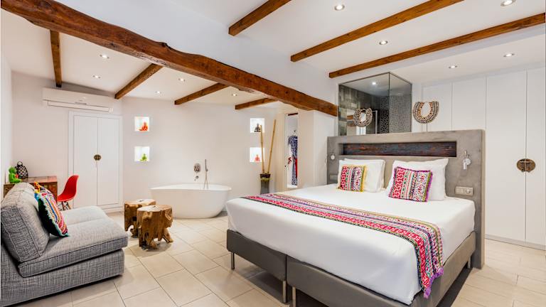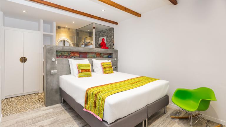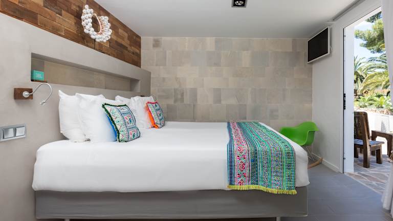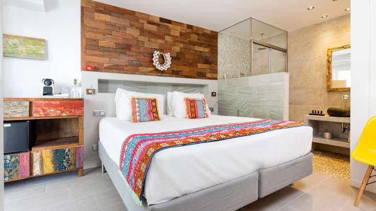 Die Zimmer im Hotel Ibizazen sind individuell gestaltet und mit einzigartigen Dekorationen ausgestattet. Zur Ausstattung gehören ein Flachbild-Sat-TV, eine Nespresso-Kaffeemaschine und ein kostenfreier Safe. Das Badezimmer ist durch eine Glaswand in das Zimmer integriert und verfügt über einen Bademantel, Hausschuhe und eine Regendusche oder eine Badewanne. Einige Zimmer bieten zudem eine eigene Terrasse mit Blick auf den Garten oder den Pool.