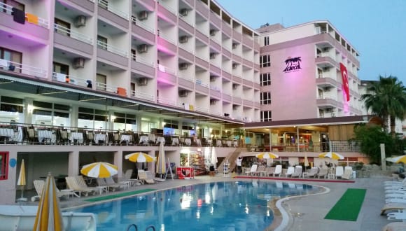 Das Hotel liegt in Alanya, nur etwa 50 Meter vom Strand entfernt. Die Strandbeschaffenheit variiert je nach Jahreszeit zwischen sandig und kiesig. Der Flughafen Antalya befindet sich in einer Entfernung von etwa 140 km, während das Stadtzentrum von Alanya rund 15 km entfernt ist.