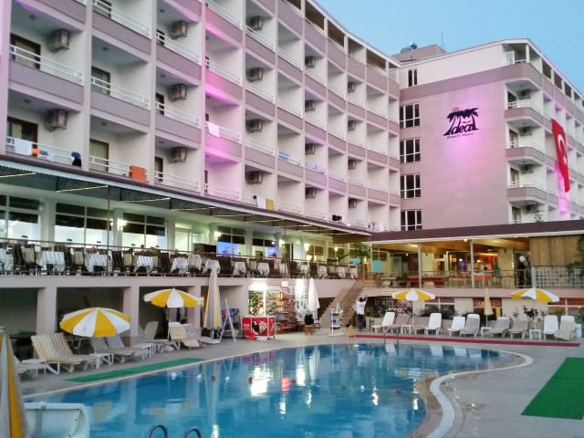 Das Hotel Ideal Beach ist ein 5-stöckiges Haus mit 110 Zimmern. Es wird ein mehrsprachiges Team an der Rezeption angeboten und verfügt über verschiedene Einrichtungen wie eine Wechselstube, einen Geldautomaten, einen TV-Raum, eine Autovermietung, einen Wäscheservice, einen Friseur und einen Hotelarzt. Zur Verfügung stehen auch WLAN (gegen Gebühr) und ein schöner Garten sowie ein Spielplatz.